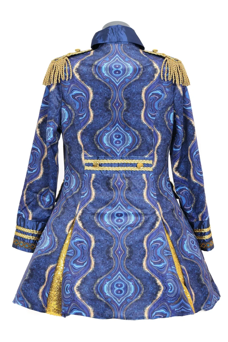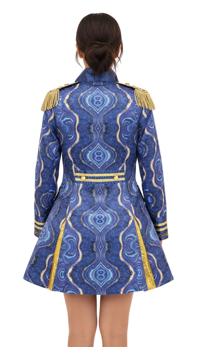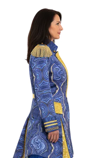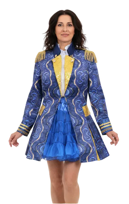 Een mooie carnavalsjas met blauwe en gouden accenten. De jas is op de schouders en mouwen afgewerkt met prachtige details.