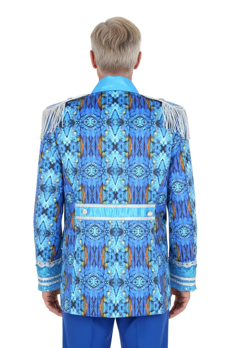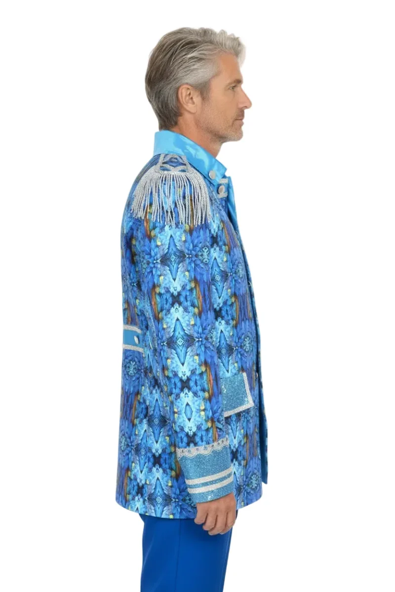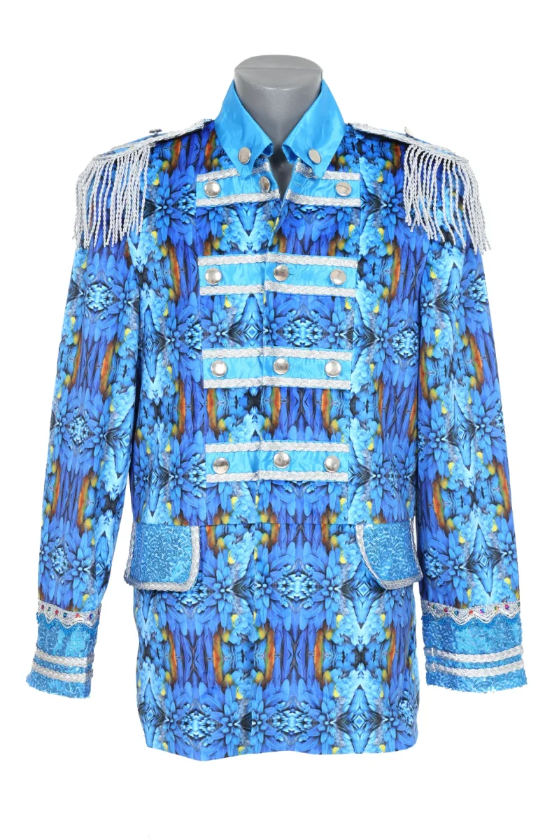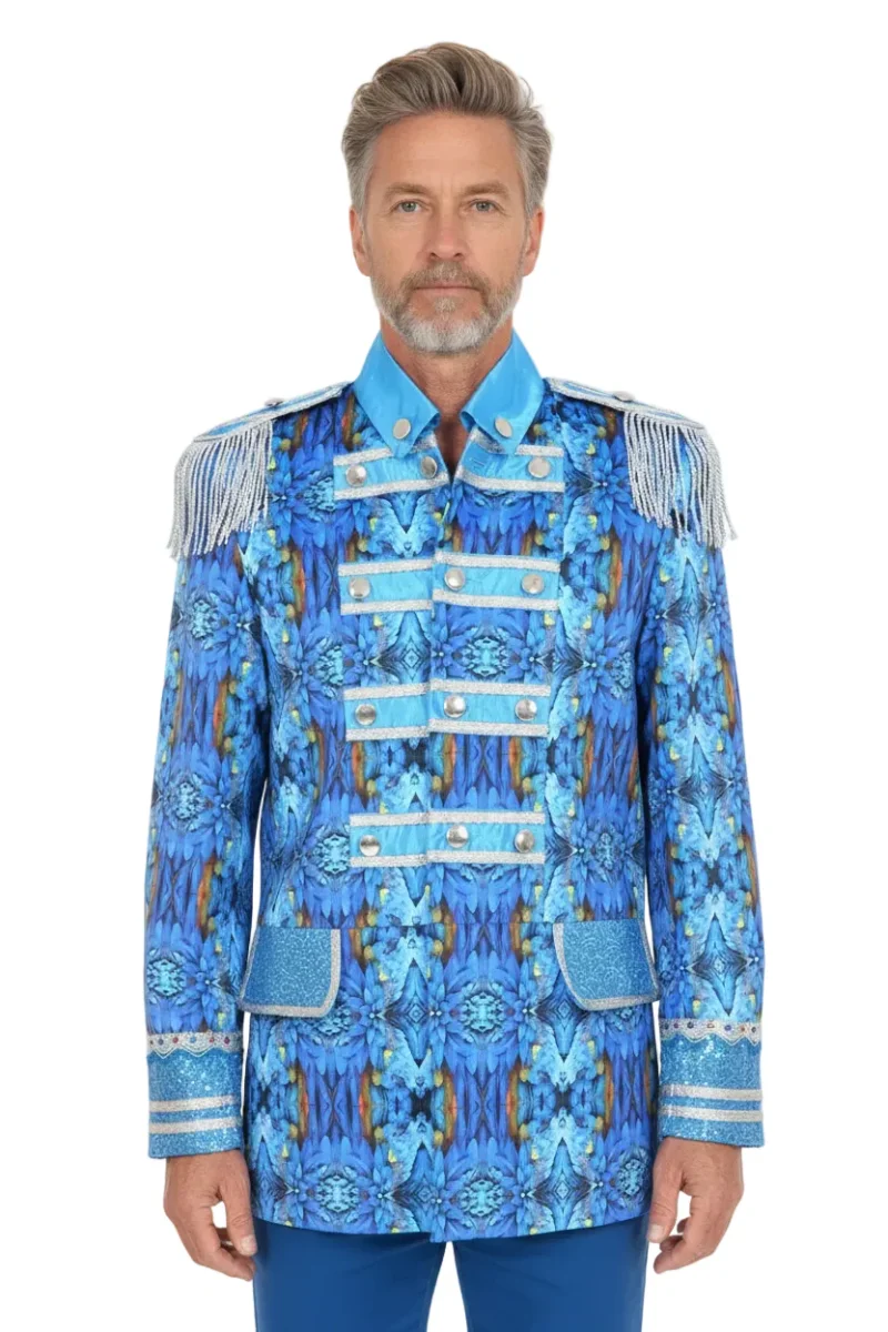 Een mooie carnavalsjas met blauw/zilver patroon. De jas is op de schouders en mouwen afgewerkt met prachtige details.