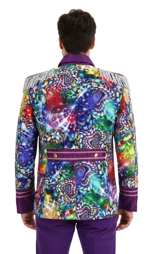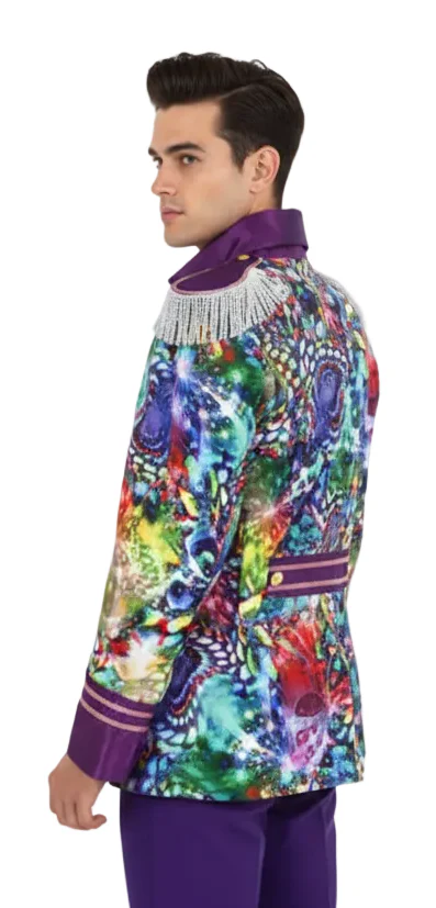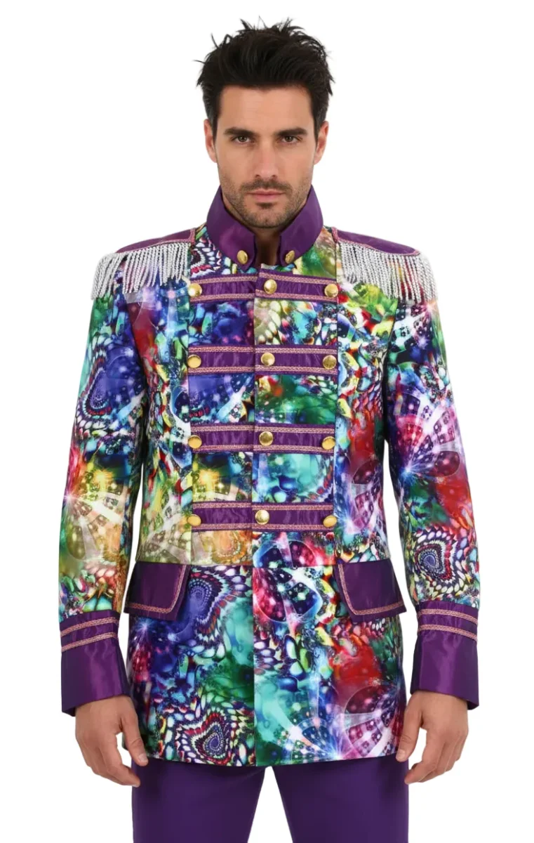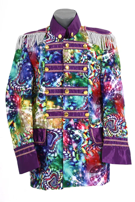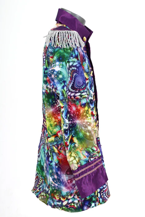 Een mooie carnavalsjas met gekleurde accenten. De jas is op de schouders afgewerkt met prachtige details.