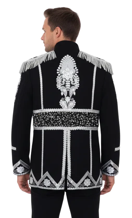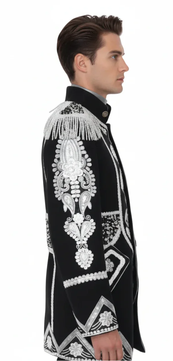 Een mooie Carnavalsjas Heren Zilver deluxe. De jas is op de schouders , aan de voor- en achterzijde en op mouwen afgewerkt met prachtige details.