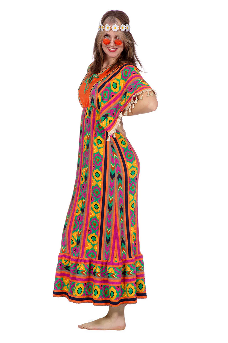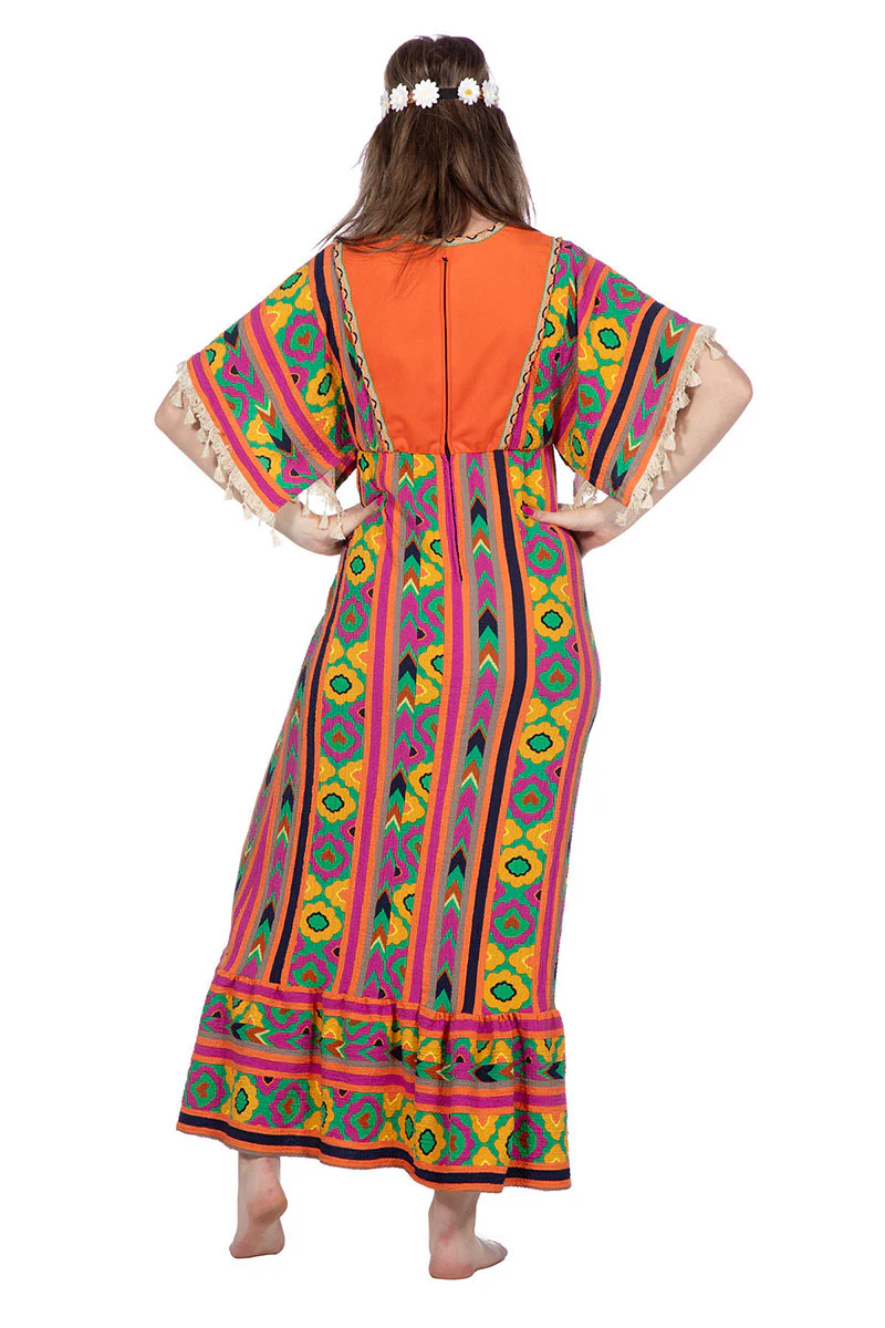 Een mooie Hippie jurk met jaren 70 motief. Bohemian & stijlvol – Deze lange hippiejurk ademt de vrije geest van de seventies.